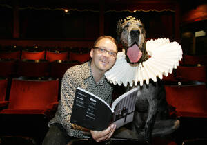 Throw him a frickin’ bone for chrissakes. Who dresses a dog like that? Still. He does look happy. And why not? Last night he got to meet Director of the Ulster Bank (cough) Dublin Theatre Festival Loughlin Deegan. In what BS has decided might be a stroke of genius (one, sadly, too late for Monty) Loughlin and his friends are putting on a competition for actors to vie for the role of Hamlet. The, eh, great Dane. The festival’s not on until September so this was the launch of the programme. In about an hour we shall have another of our wonderful slide shows where you can see who else would literally turn up to the launch of a theatre programme. The dog’s name is Toby. Good morning.