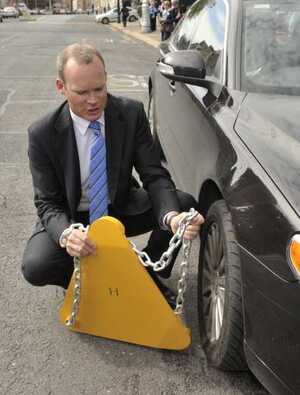 Fine Gael transport whatever Simon Coveney removes a pretendy clamp to highlight the blight of illegal clampers.