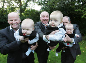 Dragon’s Den judges Sean Gallagher, Niall O’Farrell and Gavin Duffy promoting this weekend’s ‘Mid-Career Van Morrison Lookalike Competition (Infant Division)’ in Stephen’s Green this morning.