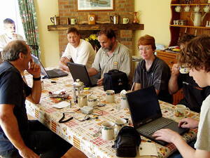 Karl’s aunt’s kitchen this morning as we compiled the top 11 of our first 11 weeks.