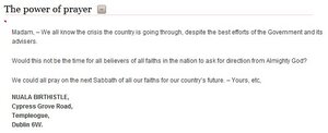 Some People Are On Their Knees Admin at 2:30 pm November 15, 2010 (From today’s Irish Times) Oh come on. Superstitious nonsense. It’s because of the government’s best efforts, Nuala. Silly! FacebookTwitterPinterestSponsored Link