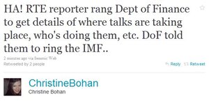“Here you can see Ajai Chopra (on the left), the deputy director of the European department of the IMF, walking towards the Central Bank of Ireland where the talks are taking place. We can’t immediately identify his colleague, I’m afraid, but once we have a name I”ll let you know. Unless you’ve got an idea?…”
