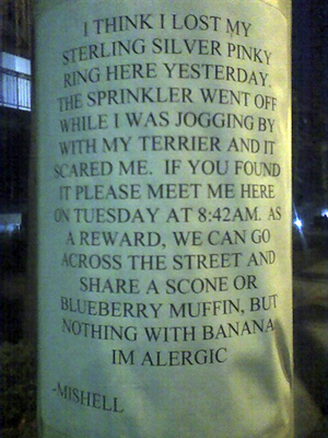 You Found A Silver Pinky Ring. Hooray! Niall Murphy at 4:15 pm January 5, 2011 Drop the ring. Keep walking. source FacebookTwitterPinterestSponsored Link Related posts: Engage We Don’t Normally Do This – Christmas Puppy Edition A Package With An Australian Address Do You Work The Stephen’s Green Taxi Rank?