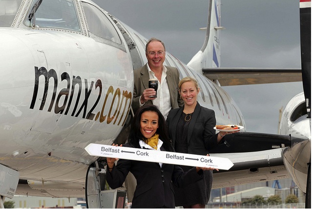Noel Hayes, Chairman of Manx2.com with Miss Northern Ireland, Lori Moore (holding sign) and Katy Best from Belfast City Airport, launching the Belfast-Cork route last year.