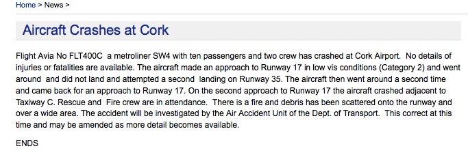 Report: Plane Crash In Cork. 12 People On Board. Six Now Confirmed Dead. Tried To Land Three Times In Heavy Fog