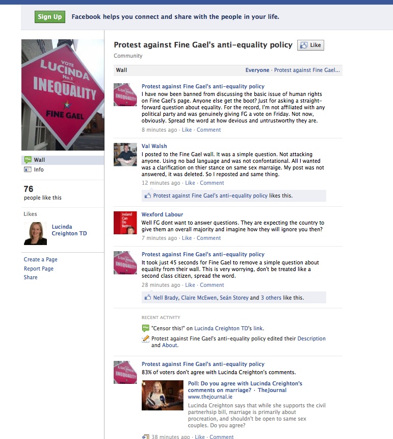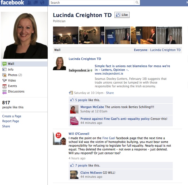 Lucinda’s Facebook wall, Fine Gael’s Facebook Wall