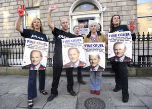 Ad agency JCDecaux has told campaigners from animal rights group ARAN (above, with Independent TD Maureen O’Sullivan this afternoon) that the ‘blood’ spattered image above is not suitable for the spot, metres from the party’s office.