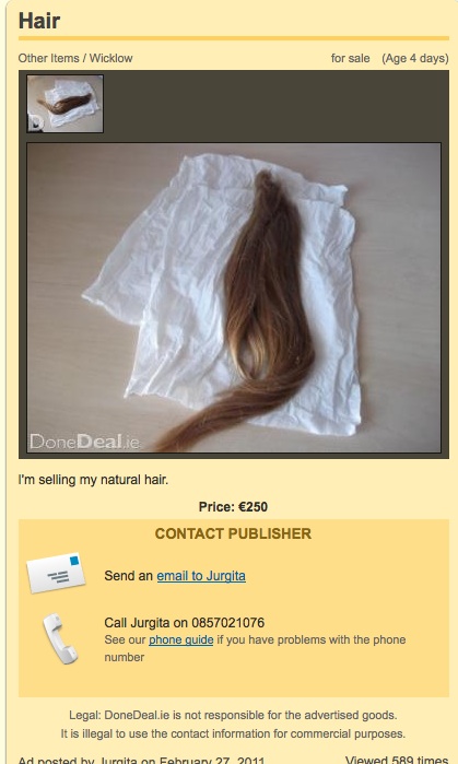 You Have Seen The Hair On Sale In Wicklow? Admin at 10:25 am March 4, 2011 Here hair. Here hair here. Done Deal Via Dabarbarian FacebookTwitterPinterestSponsored Link Related posts: Twitter: OK, What Just Happened? Independents To Meet At 5pm In Leinster House Mary Mitchell O’Connor And The Plinth Of Shame: The Doh! Tapes Wendy Richard: The Morning After