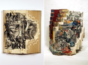 Dettmer manipulates the pages and spines to form the shape of his sculptures. He also folds, bends, rolls, and stacks multiple books to create completely original sculptural forms.