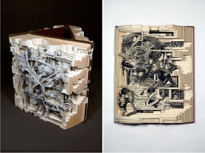 Brian Dettmer carves away sections of the pages in old books, one at a time – exposing the contents to create hyper-detailed impressionistic homages to the original material.