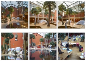 In 2006, French architecture firm Christian Pottgiesser Architecturespossibles reinvented a 19th century warehouse as a glass-roofed, tree-filled office space for two French companies, Pons and Huot.