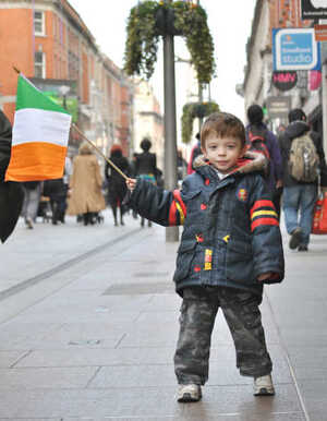 For the day before the day that’s in it. Patriotic little tyke John Beary, age 4, from Wexford in Dublin yesterday. His pensive stare reflects the national mood.