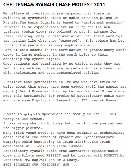 You Did See The Ryanair Protestor At Cheltenham Didn’t You? Aaron McAllorum at 8:30 pm March 17, 2011 Intruder Runs Onto Track At Cheltenham Festival In Protest At Ryanair (Mail Online) Yes, but why? Ryanair Don’t Care (Blog) FacebookTwitterPinterestSponsored Link