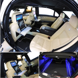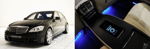 The conversion of the rather staid Mercedes-Benz S-Class into the Brabus “iBusiness 2.0” begins in the boot, with a Mac Mini mounted in a leather-lined tray inside the trunk. The Mac connects up with a 15.2-inch TFT, 16:9 aspect ratio display that mechanically unfolds from the alcantara-coated headliner and can also be used as an auxiliary display for the – not one, but two – iPad 2s mounted in the electronically deployed and adjustable custom tables mounted behind the two front seats. The tables secure both the tablets and a Apple Bluetooth keyboard, and allow the Russian mobster in back to chat with his Swedish princess over Apple’s Facetime video conferencing system.
