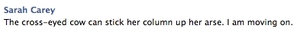 Sarah said her Facebook page was hacked. Also madam is not cross-eyed. She suffers from amblyopia, otherwise known as a lazy eye.
