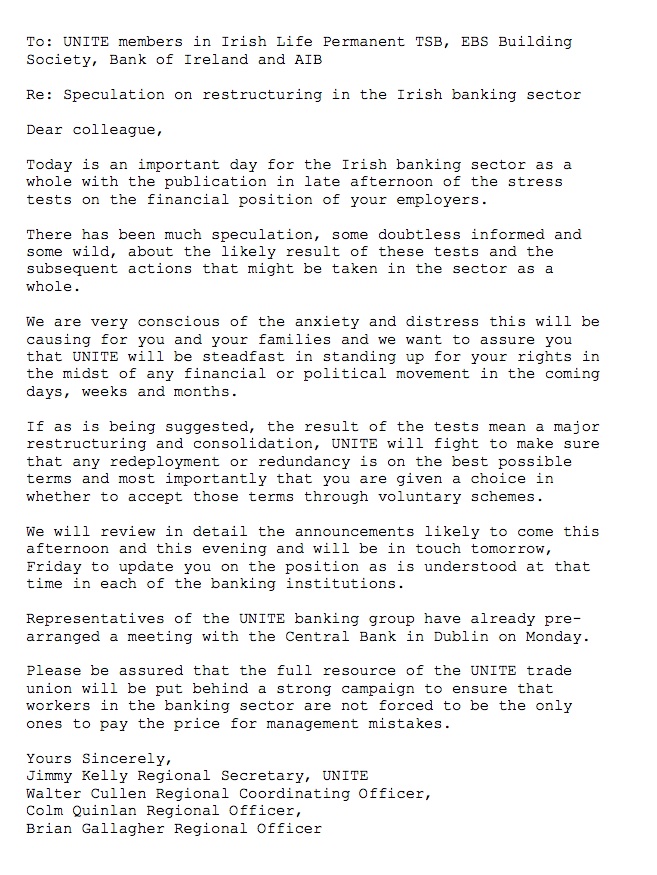 “Please be assured that the full resource of the UNITE trade union will be put behind a strong campaign to ensure that workers in the banking sector are not forced to be the only ones to pay the price for management mistakes.”
