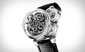 Anarchy takes hold of the hours indication beneath the sapphire-crystal dome every 60 minutes. The numeral of the hour, assembled in the center of the circle, explodes into chaos before instantly reassembling as the new hour. It then remains still until the next disintegration. Instead of a hand, 24 placards revolve and rotate on a complicated system of gears mounted on an epicycloidal gear-train.