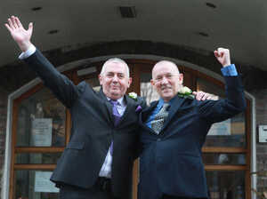 Just Civil Partnershipped: Barry Dignam and Hugh Walshe at the registration office in Dublin this afternoon: the first same sex couple in Ireland to publicly tie the knot.