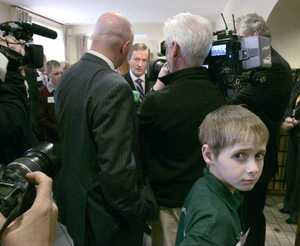 Conor McGarvey (11) from Scoil Eoinpol in Loughanure, Co. Donegal, and Enda at the National Youth Entrepreneurship Strategy Forum.