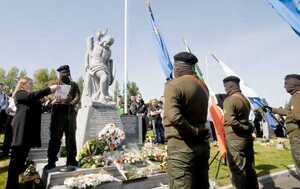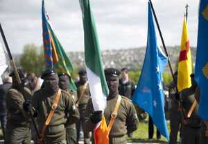 Marian Price holds a statement for a masked member of the Real IRA to read at the Easter Commemoration of the 32 County Sovereignty Movement at the City Cemetery in Creggan, Derry, yesterday.