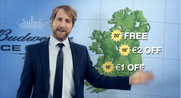 Only available to people who download the ‘Budweiser Ice Cold Index’ mobile app. They will receive €2 off at “participating Index bars” when it’s 18°C or 19°C, and a €1 mobile voucher when it’s 16°C or 17°C.”