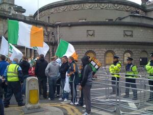 Eirigi supporters on their way to the Garden of Remembrance, this afternoon.