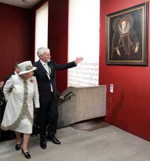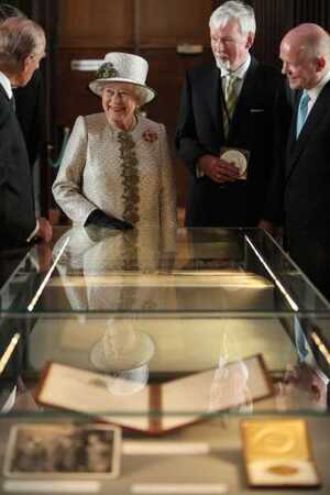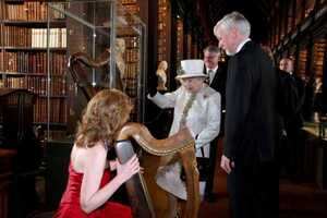 Second pic: Viewing a facsimile of the Book of Kells with the Provost of TCD, Dr. John Hegarty, Librarian Robin Adams, and Chancellor of the University Dr. Mary Robinson; 3rd pic: With Dr. Hegarty and Harpist Siobhan Armstrong playing a 15th century harp; 4th pic: face to face with a portrait of Queen Elizabeth I.