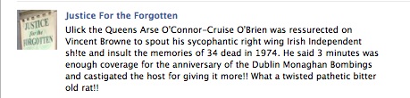 Accusing Vincent Browne of “acting the maggot”, Ulick complained that too much time was being given over to the anniversary of the Dublin/Monaghan bombing.