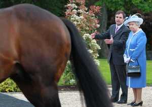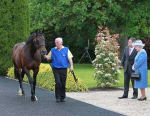 ‘Invincible Spirit’ gets the once-over from Elizabeth Her Gracious Majesty and John Osbourne (bottom pic), from the National Stud, in Kildare literally minutes ago.