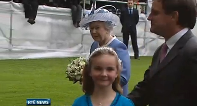 UPDATE: The man is John Osbourne, who runs the National Stud, and the girl he shoves is his own DAUGHTER, Emma, age 8, pictured below, moments before the push. Oh, the humanity.