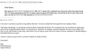 In the run up to yesterday’s last-ever Oprah Show, emails have been flooding in from fans. Inevitably, given the similar spelling, some have ended up being sent to the browser company Opera, whose accommodating staff have been collating the best as a kind of oblique farewell tribute.