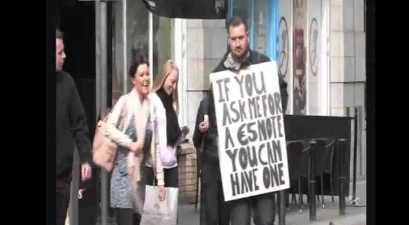 Emotionless and wearing a sandwich-board he strolled around the capital during rush hour handing out €5 notes.