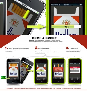 Using Bump technology, social smokers are able to bum virtual cigarettes from hardcore smokers and exchange them for real ones with an electronic coupon. This is supposed to curb the (apparent) problem of occasional smokers having to go out and buy an actual whole pack of cigarettes and power smokers who might actually have to lose a single cigarette from their pack.