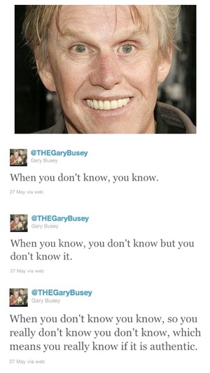 Gary Busey On Knowledge Niall Murphy at 4:44 pm May 30, 2011 Oh, we know, Gary. We know. TheGaryBusey On Twitter FacebookTwitterPinterestSponsored Link Related posts: And So, A Movement Was Born #signofthetimes For Those Who Don’t Tweet Social Media IRL