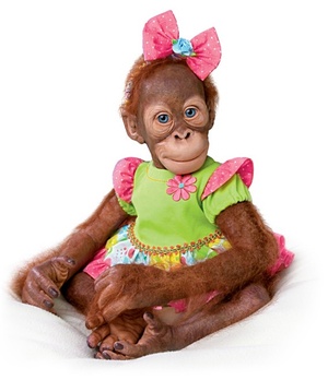 She’s always dressed for fun! Make a play date with Mollie, an adorable orangutan doll created by master sculptor Simon Laurens – his Ashton-Drake Galleries debut! You’ll delight in her exceptional realism, like the wrinkles around Mollie’s pretty blue eyes and mouth, and the tiny folds and creases on the bottom of her feet, just like real orangutans. She has hand-painted nails, and wispy hand-applied auburn hair that is adorned with a big bow.