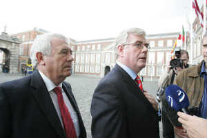 Eamon Gilmore and Labour’s Joe Costello arrive at the Lisbon Treaty count centre in Dublin Castle, June 13, 2008