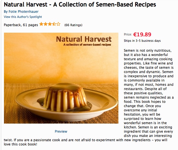 Come Dine With Me Admin at 7:24 pm June 7, 2011 Quite literally. Natural Harvest: A Collection Of Semen-Based Recipes (Lulu) Thanks Michael Le Cool FacebookTwitterPinterestSponsored Link