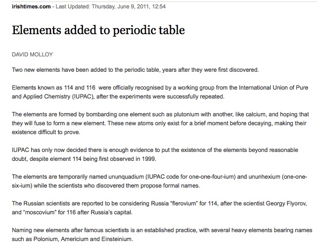 Elements Added To Periodic Table (David Molloy, Irish Times)
