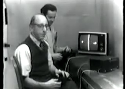 Ralph Baer, with joystick and tank-top, demonstrates the forerunner to Atari’s Pong.
