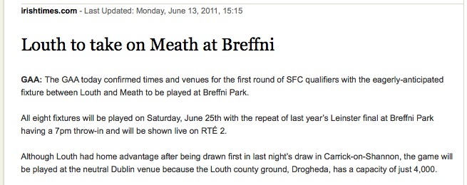 Today’s Irish Times Typo: Say It Louth Admin at 5:25 pm June 13, 2011 “neutral Dublin venue…” In Cavan? Really?? Thanks Lou FacebookTwitterPinterestSponsored Link