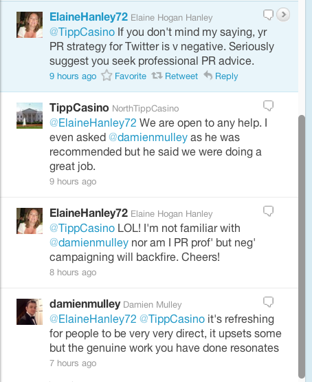 Is The Internet Going Mad? Admin at 11:13 pm June 22, 2011 OK. That @TippCasino was supposed to be a fake account? And why is the Damien Mulley sucking up to the replica White House people? Who is Elaine Hanley? Why has she a second surname? Could somebody please tell us what is going on? FacebookTwitterPinterestSponsored Link