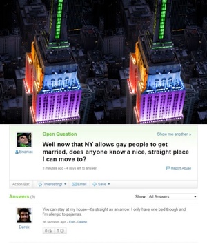 Straight Question: Yahoo Answer Admin at 1:34 pm June 26, 2011 via FacebookTwitterPinterestSponsored Link Related posts: Trading Places Pride On Parade George Takei Versus Traditional Marriage Fans Ask Gary Busey