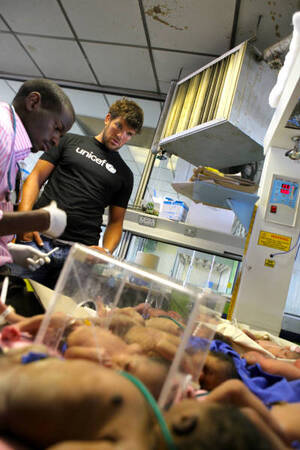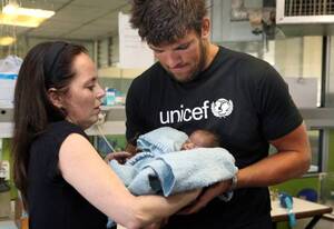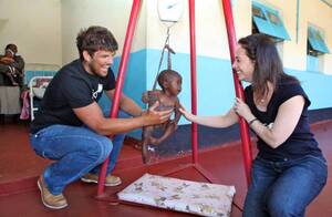 Donncha O’Callaghan in Harare with UNICEF Ireland’s Melanie Verwoerd at the Harare General Hospital and the Kanuka Rural Hospital (bottom pic) with 18-month-old baby girl Marasma.