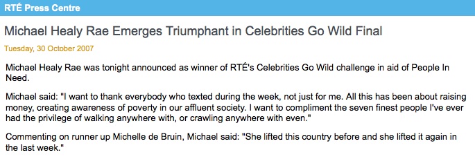 Michael Healy-Rae, who was Mayor of Kerry at the time of the TV show, took his father’s seat in Kerry South at the last election. He is also – hilariously – on the Citizen’s Advice Board, appointed by the last government on the orders of his dad.