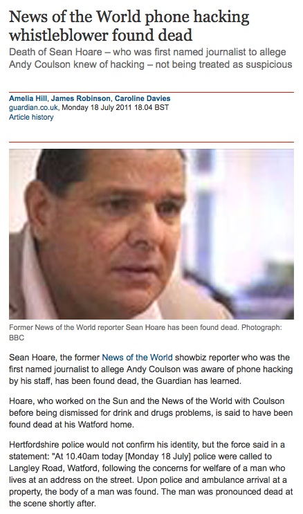 Death Of A Whistleblower Admin at 6:14 pm July 18, 2011 News Of The World Phone Hacking Whistleblower Found Dead (Guardian) FacebookTwitterPinterestSponsored Link