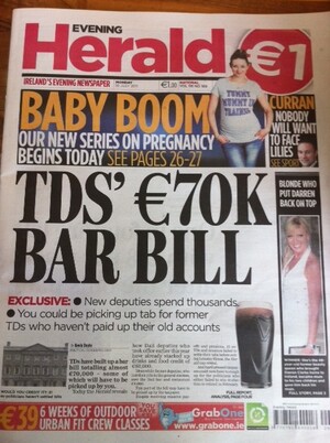 “Despite receiving massive pay offs and pensions, 31 ex-TDs and senators failed to settle their tabs before exiting Leinster House [after the general Election].”
