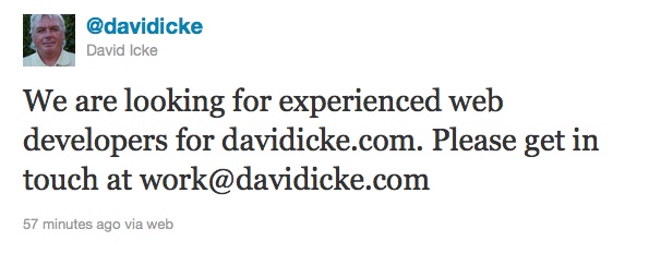 Do You Want To Work At David Icke? Admin at 11:38 am July 21, 2011 David Icke on Twitter FacebookTwitterPinterestSponsored Link
