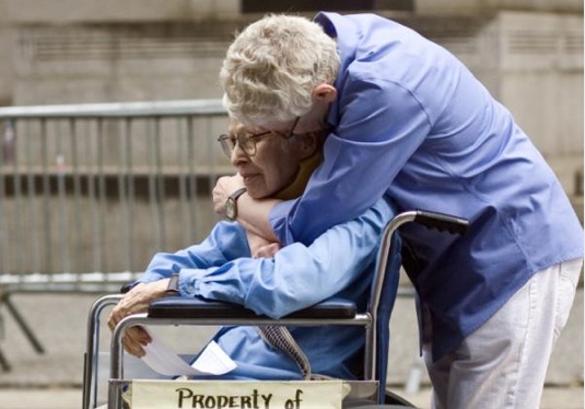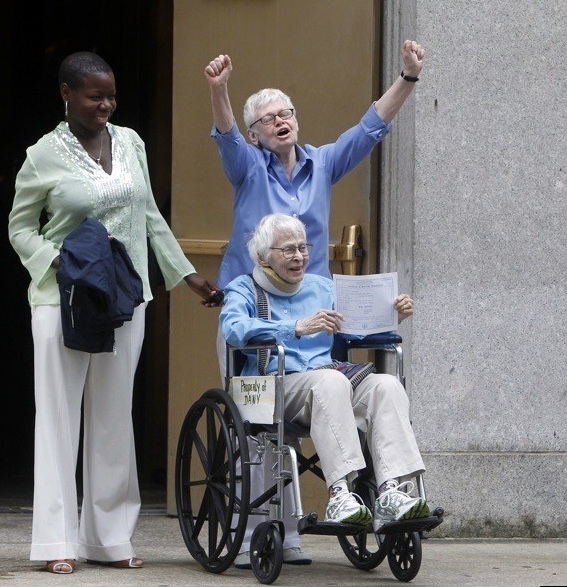 Phyllis Siegel, 76, left, and Connie Kopelov, 84, both of New York, on Saturday after becoming the first same-sex couple to get married at the Manhattan City Clerk’s office.