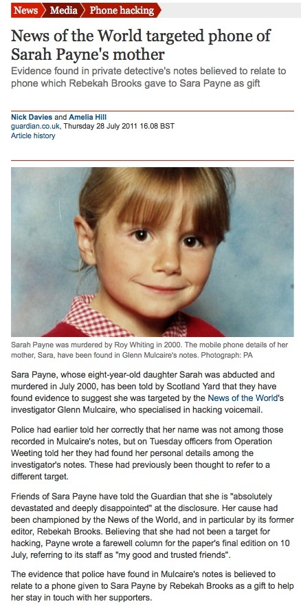 Sara’s Law Admin at 4:47 pm July 28, 2011 News Of The World Targeted Phone Of Sarah Payne’s Mother (Nick Davies, Amelia Hill, Guardian) Tom Watson on Twitter FacebookTwitterPinterestSponsored Link