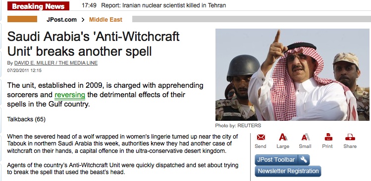 “When the severed head of a wolf wrapped in women’s lingerie turned up near the city of Tabouk in Northern Saudi Arabia, authorities knew they had another case of witchcraft on their hands.”